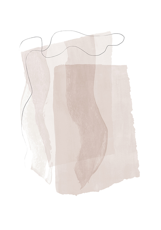 Fragmenter nr. 2 – Beige toner. Abstrakt kunst i duse beige-toner. Det består av overlappende, ujevne former i ulike nyanser av beige og lys brun, noe som gir et mykt og rolig uttrykk. En tynn, svart linje bukter seg løst over motivet og skaper en subtil kontrast. Bildet har en minimalistisk og moderne stil som passer godt i nøytrale interiører.